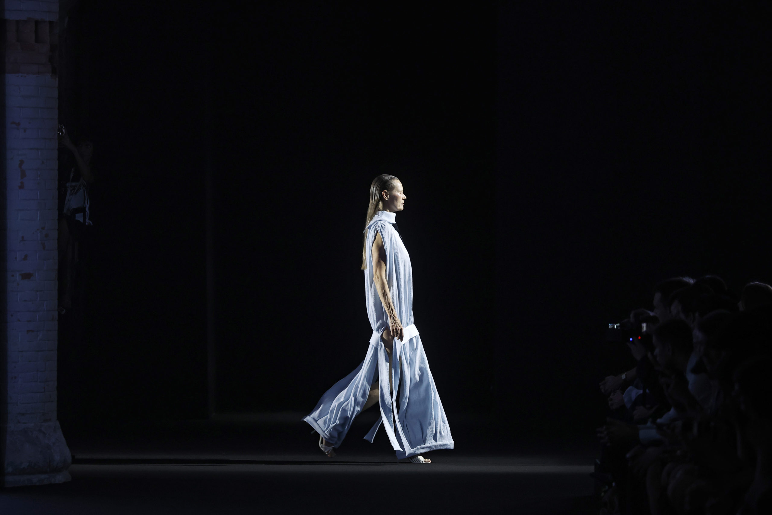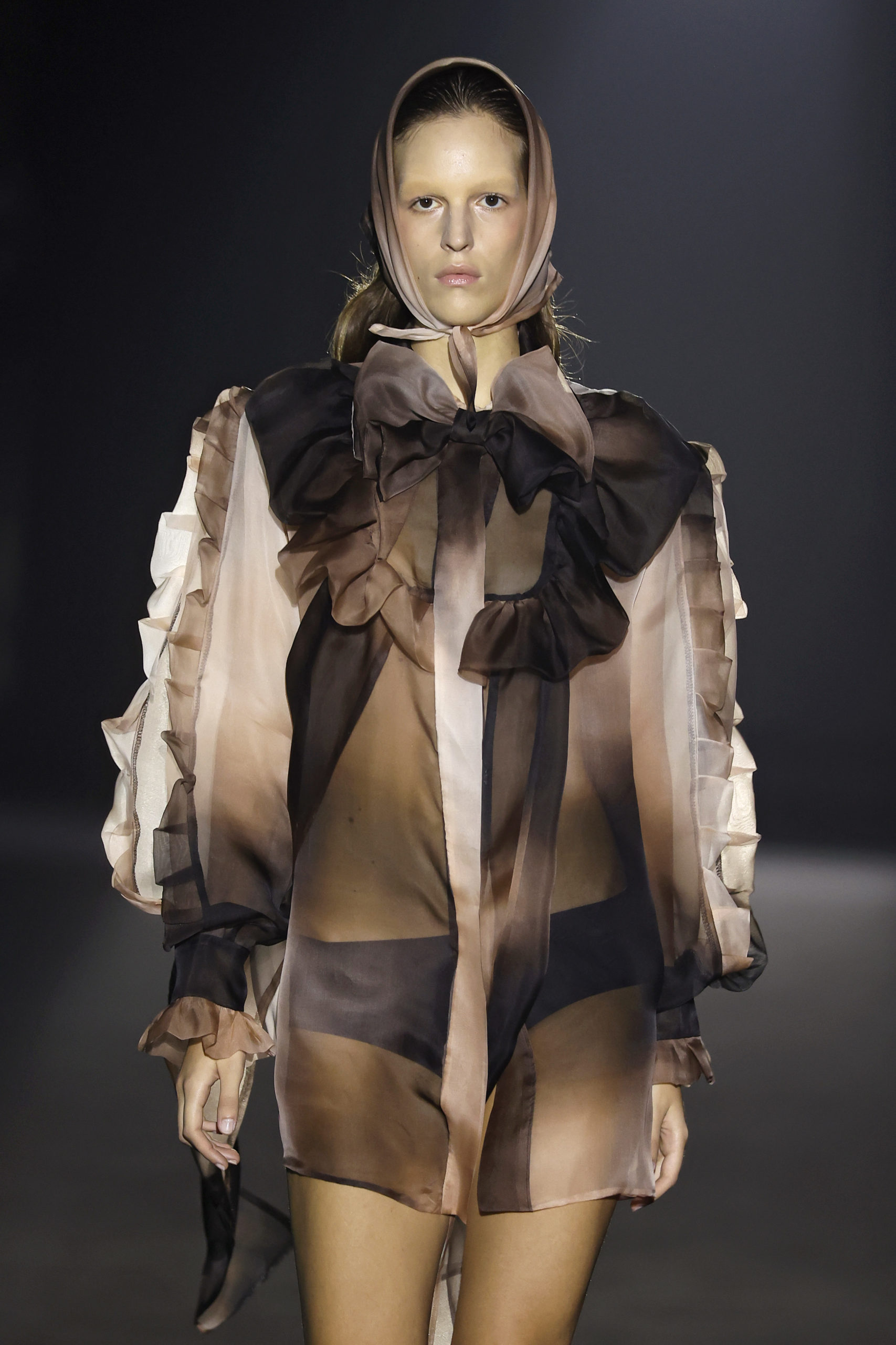 Entre luces tamizadas y una atmósfera casi mística, Gau presentó un viaje visual en el que el gótico, la sensualidad y el exceso convivieron en un mismo plano. La propuesta apostó por silhuetas extremadas, tejidos brillantes, transparencias y contrastes entre el deseo y la oscuridad, reafirmando el ADN experimental de la marca.