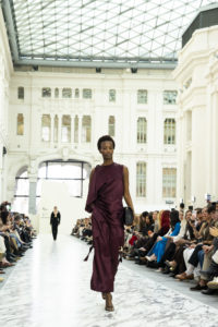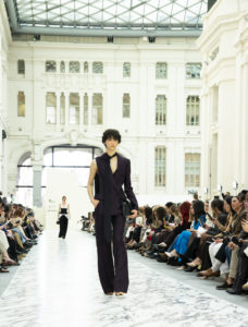 La paleta se mantuvo contenida negros, granates, grises, lo que ayudó a que toda la atención se centrara en las formas y en esos destellos de luz que aparecían casi como sorpresa. No era una colección para impresionar  a primera vista, sino para ir descubriéndola look a look.